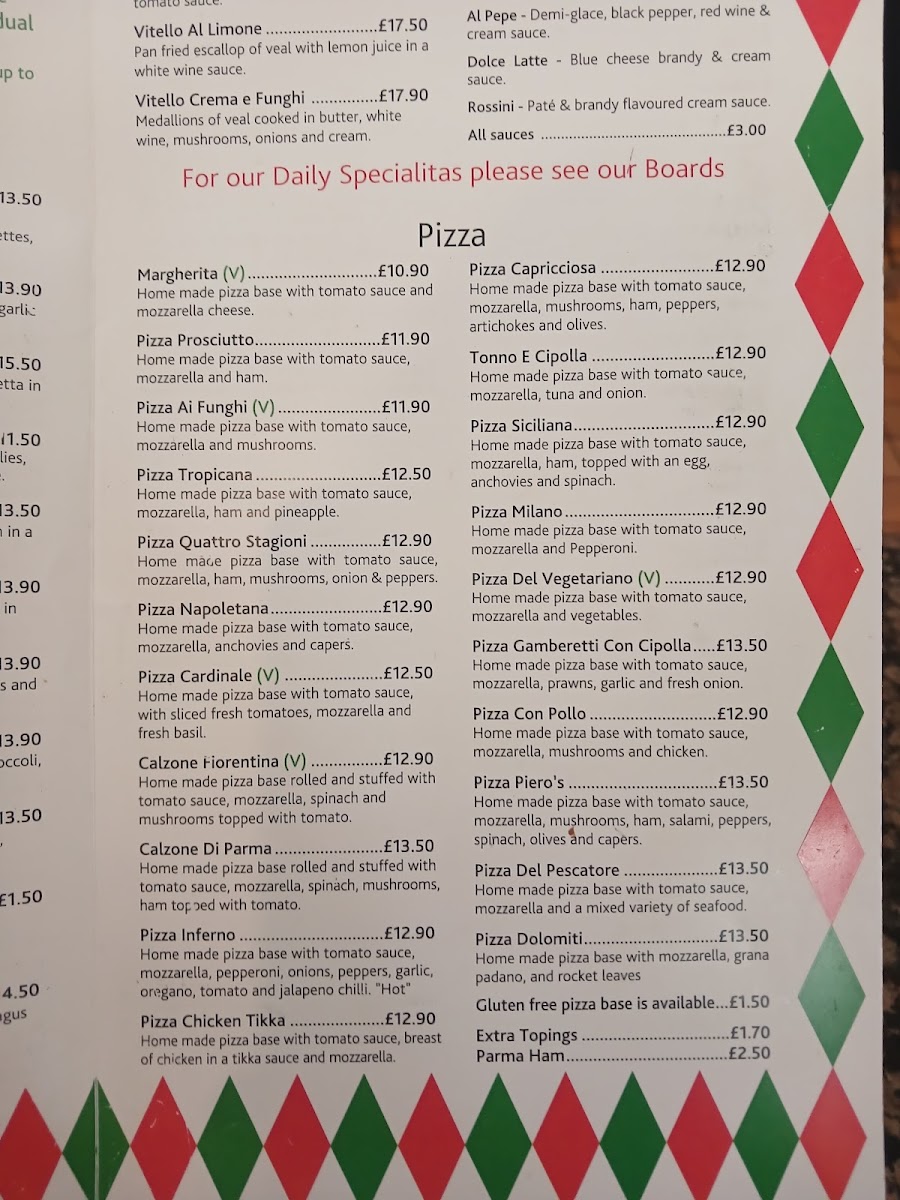 Piero's Pizzeria, located on Kenwyn St, Truro TR1 3DJ, offers an impressive menu filled with traditional Italian flavors and a warm, welcoming atmosphere. Whether you're craving a classic Margherita or something more adventurous, Piero’s Pizzeria delivers delicious pizzas crafted from fresh, quality ingredients.